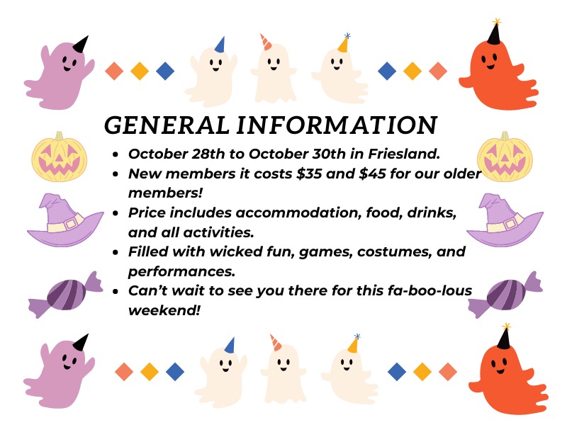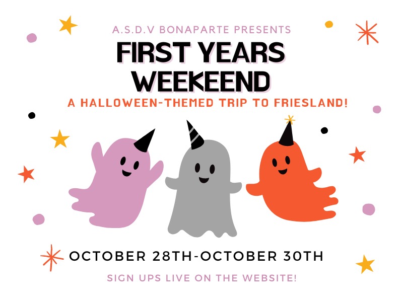Our first year’s weekend will be from October 28th to October 30th in Friesland. For new members it costs €35,- and €45,- for our older members! With prices this low, it’s basically eerie-sistable! This price includes accommodation, food, drinks, and all activities. The weekend will be filled with wicked fun, games, costumes, and performances. Can’t wait to see you there for this fa-boo-lous weekend!