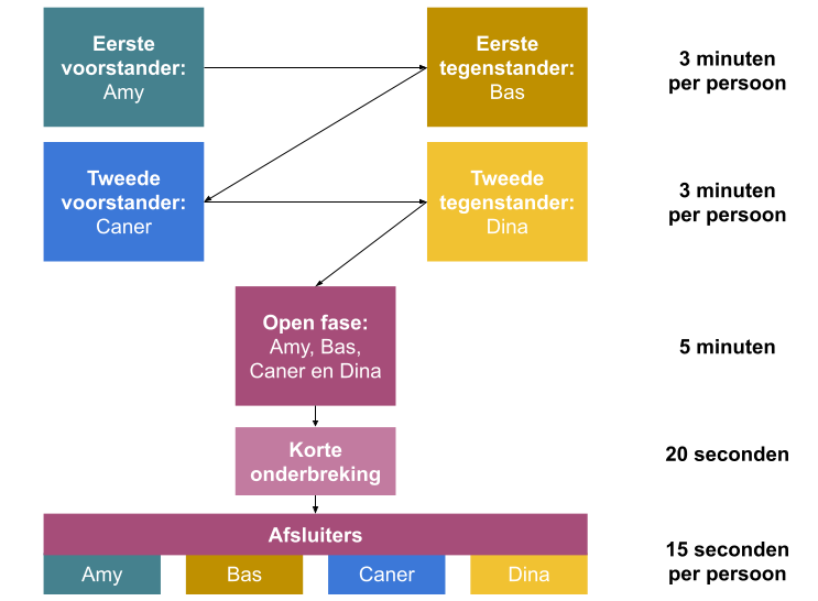 Na de tien minuten begint het debat, met daarin vier individuele sprekers. Er zijn twee voorstanders en twee tegenstanders, maar zij zitten niet in hetzelfde team! Iedere spreker heeft in het debat een speech van drie minuten en daarnaast is er ook een vrije ronde waar er ruimte is voor een discussie. Elk debat eindigt met een slot van vijftien seconden per persoon. Het mooie kleurrijke plaatje hierboven geeft schematisch weer hoe het debat werkt.